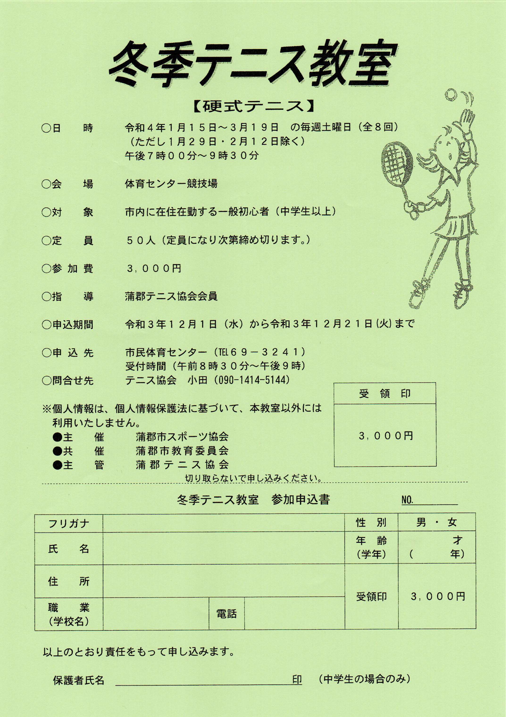 新型コロナウイルス感染症の影響がまだまだ改善されていない状況を踏まえ、また蔓延防止等重点措置が3月21日(月)まで延長されたことを受け、今回の冬季テニス教室を全て中止させていただくことになりました。